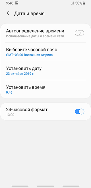 Одна из самых простых причин возникновения ошибки – неправильно установленные дата и время. Они не всегда соответствуют срокам действия сертификатов Google, в результате чего может возникать ошибка. Для ее устранения достаточно выяснить подходящий часовой пояс и установить его на своем телефоне.