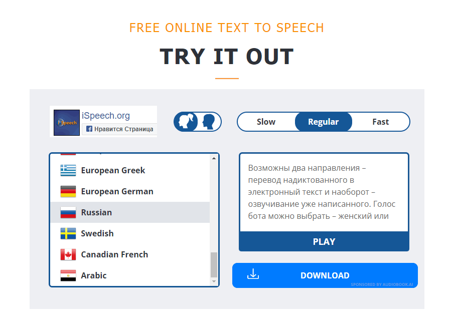 2. readspeaker – облачное преобразование текста в аудио. Русский язык есть, два варианта произношения.
