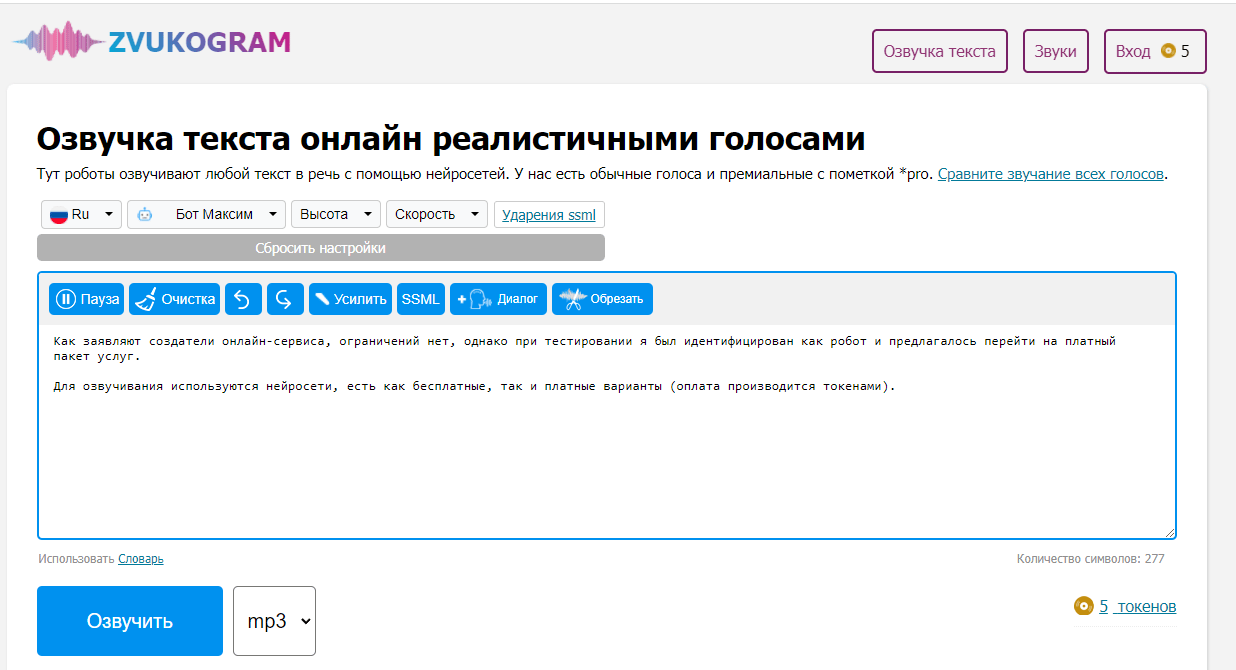 Для озвучивания используются нейросети, есть как бесплатные, так и платные варианты (оплата производится токенами).