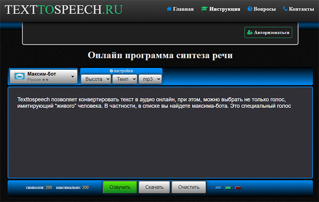 Texttospeech позволяет конвертировать текст в аудио онлайн, при этом, можно выбрать не только голос, имитирующий “живого” человека. В частности, в списке вы найдете максима-бота. Это специальный голосовой бот для озвучки, который роботизированным голосом произносит введенный текст.
